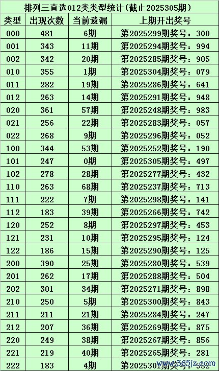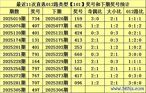 上期讲究:体彩成列三第2025305期开出奖号:497,其012路比为1:2:0,奖号012路类型为:101。